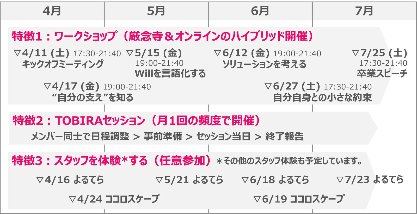 A1. TOBIRAは、自分の "Will(心の声)" を言語化し、夢に向かって具体的な一歩を踏み出すためのライフプログラムです。全6回のワークショップと各回で出される課題(宿題)と向き合い、そして参加者同士でのセッションを通じて "自ら行動する力" を養っていきます。毎回課題が出るそれなりに大変なプログラムだと思いますが、皆さんの真剣な気持ちにスタッフも真剣に応えていきます。共に4か月間を歩んで行きましょう!